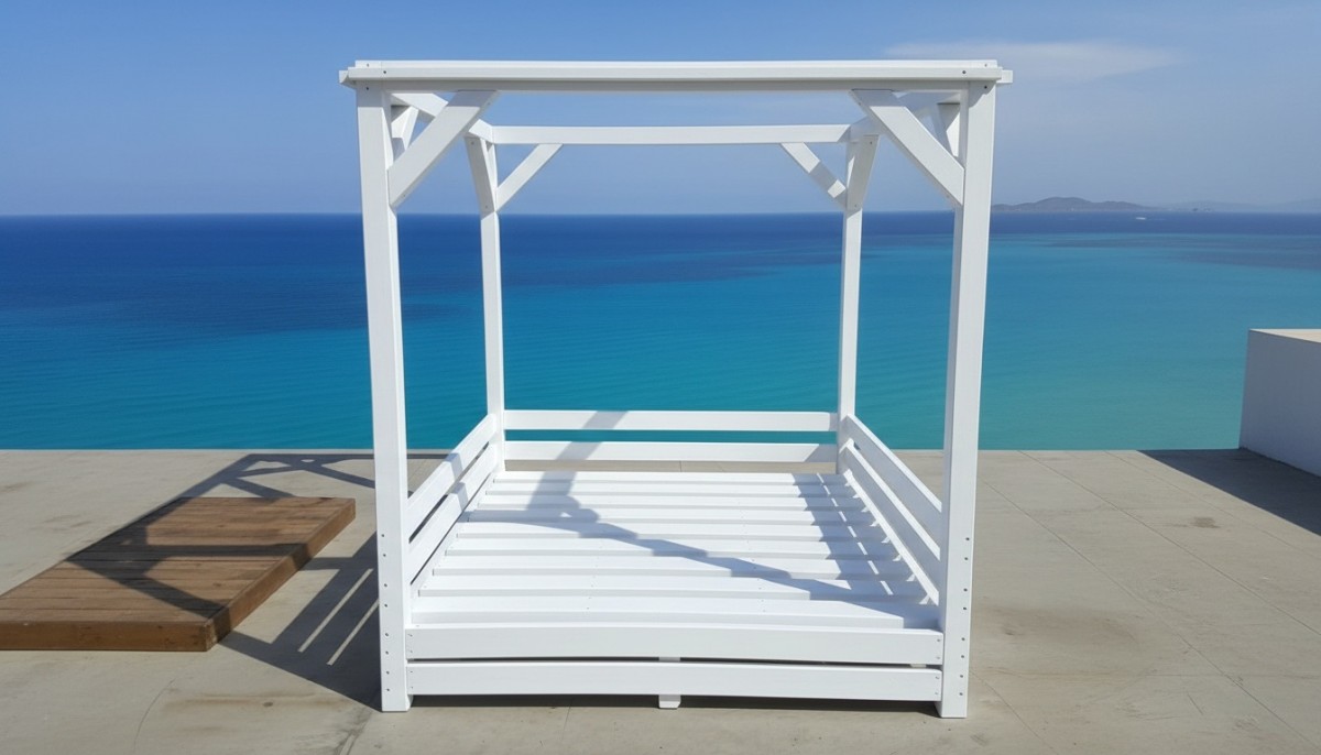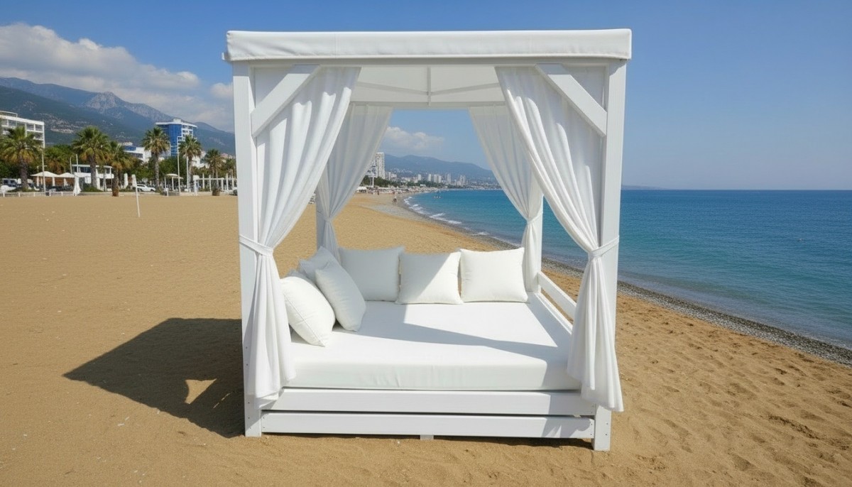 Пляжная беседка сверху и с одной из сторон прикрыта специальным переплетающим полупрозрачным тентом. С трех других сторон находится полупрозрачная сетка, при опускании которой кровать оказывается под легким балдахином.