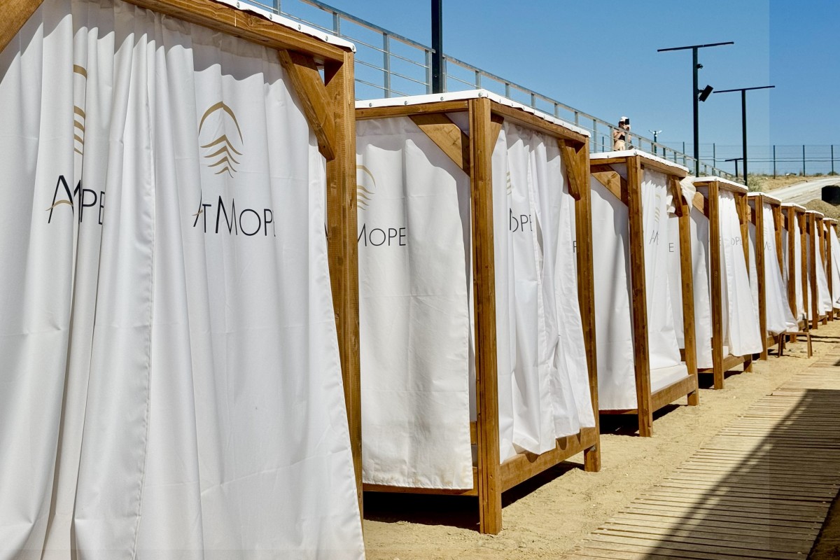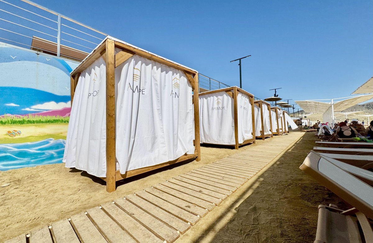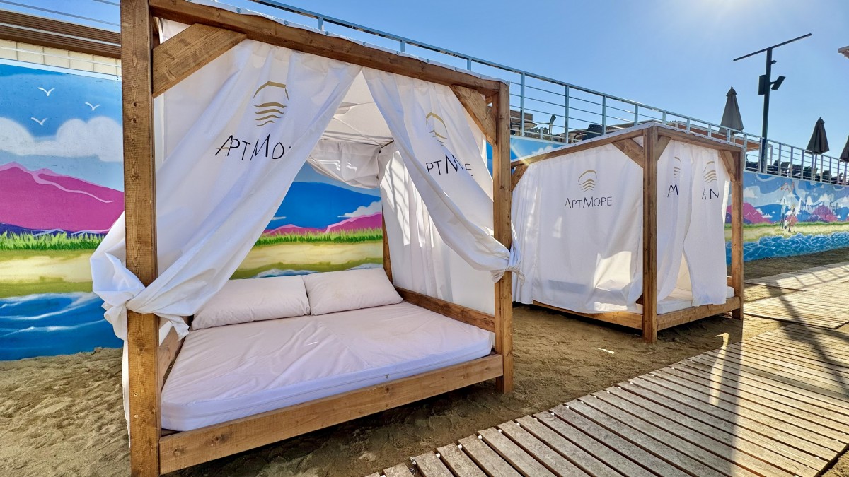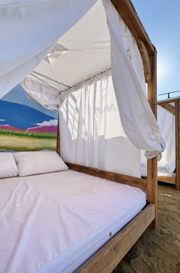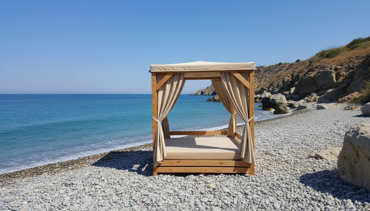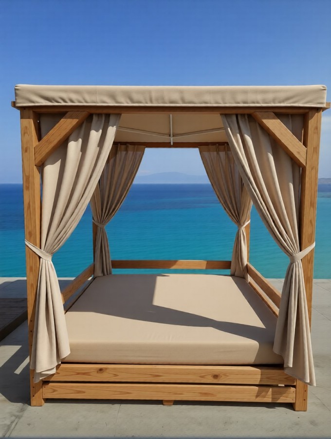 Пляжная беседка сверху прикрыта специальным тентом. С четырех других сторон находятся шторы, при опускании которых кровать оказывается под легким балдахином.