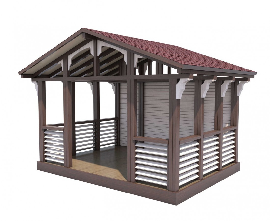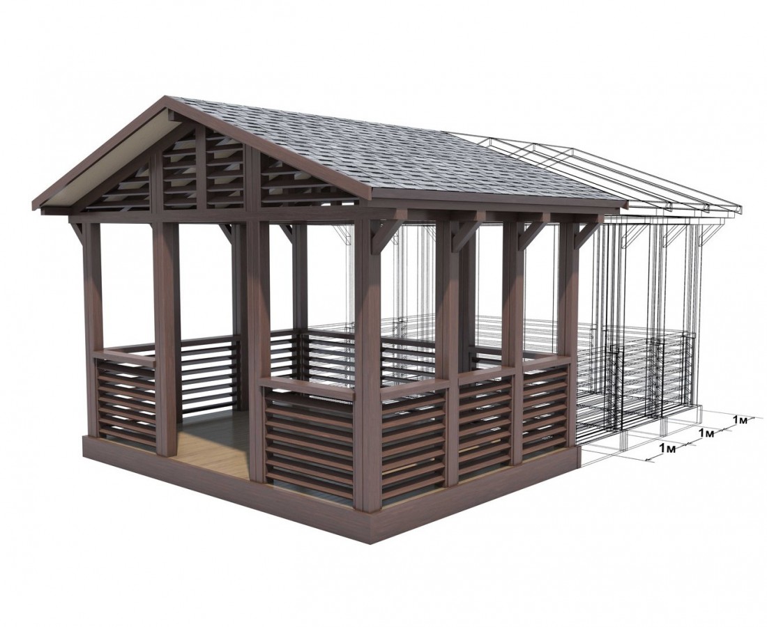 В базовом виде беседка имеет размеры основания 4х3 метра. При желании, данная конструкция может быть увеличена до 4х6 метров, что сделает беседку еще более просторной.